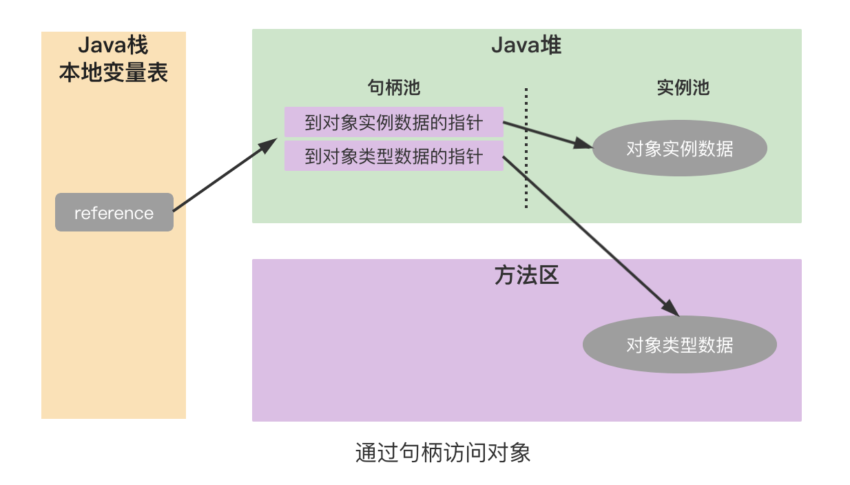 - 句柄访问:Java堆中分出一块内存作为句柄池,reference中存储对象句柄地址,句柄包含了对象实例数据和类型数据各自的地址;