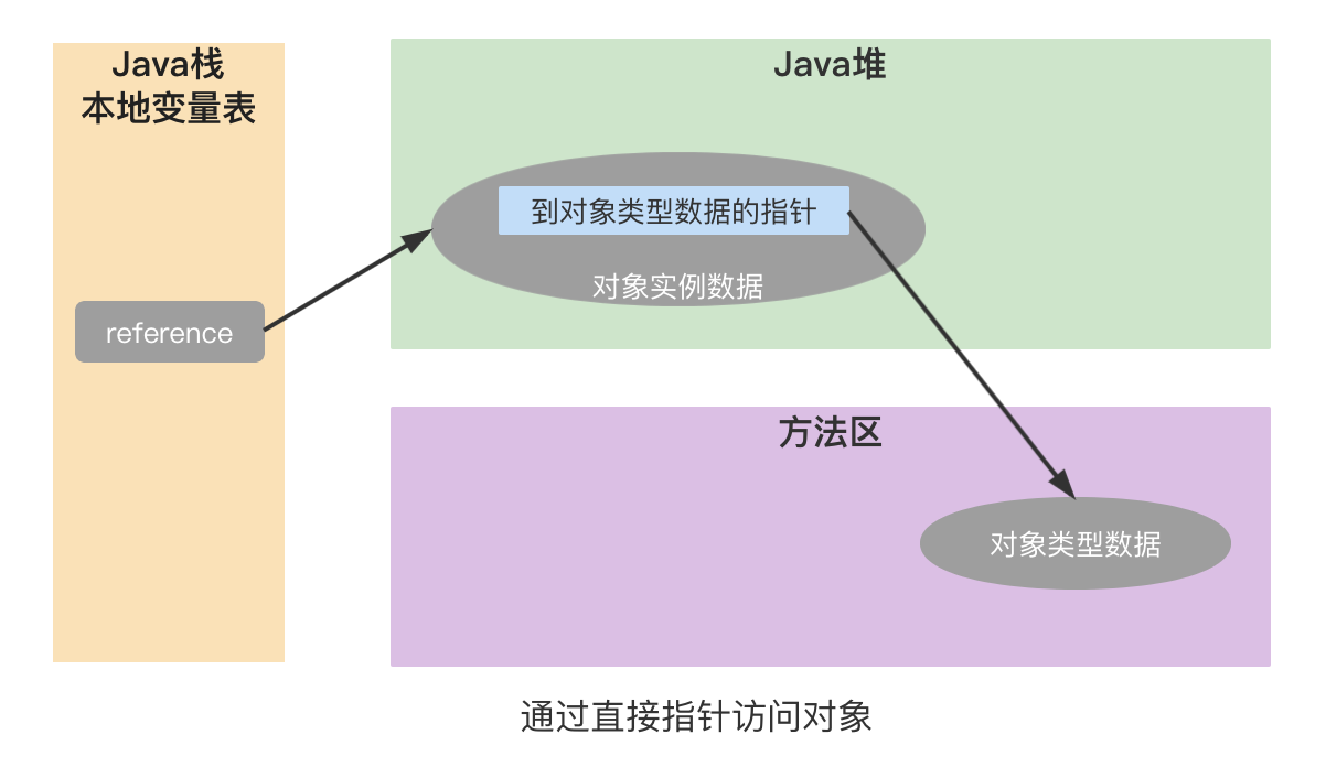 - 直接指针访问:Java堆中对象的内存中就放入对象类型数据,reference就是对象地址;