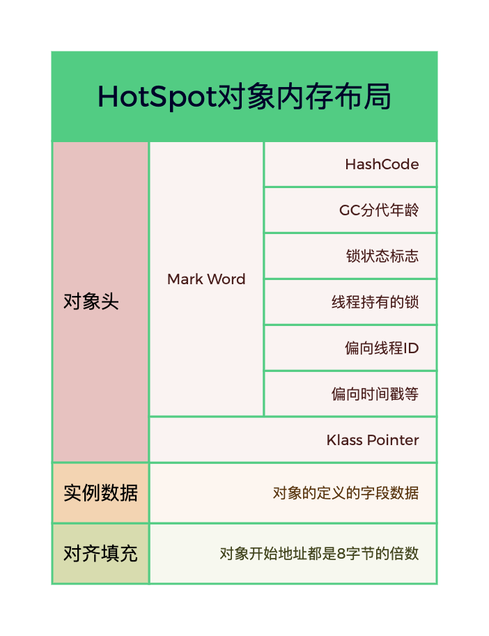 HotSpot虚拟机中,对象在内存中的存储布局分为三个部分:对象头(Header)、实例数据(Instance Data)和对齐填充(Padding)。